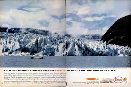 Pour nous plonger dans l’ambiance, M. Gemenne projette sur le grand écran de la salle une publicité parue en 1962 dans le magazine Life. On y voit la compagnie Humble Oil and Refining Company (aujourd’hui intégrée à ExxonMobil) se vanter fièrement : « Chaque jour, Humble fournit assez d’énergie pour faire fondre 7 millions de tonnes de glacier. »
